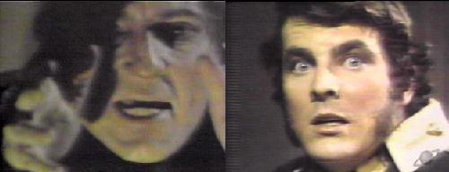 Nathan's face shakes as he contemplates this horror. Nathan starts to leave Collinwood, but hears dogs howling, which Ben says means HE'S nearby. It's 8:56. Nathan looks like his eyes are about to spring from his head. Ben leaves him, too, saying he doesn't want to be around when it happens, either. Nathan's only hope is to be with Joshua, perhaps Barnabas won't harm him then. Joshua is sitting in the study, but he refuses to be with him at 9 PM. Then Nathan spots the crossbow hanging in the study wall and tells Joshua he's right--he should go--I was being cowardly, I might as well face death like a man. Joshua sadly says he almost wishes he could do something for him, in spite of everything. He goes.  Nathan takes the crossbow down from the wall and loads it with a wooden arrow--if it pierces Barnabas' heart, it will destroy him. The front door opens and Barnabas enters. He heads to the study. Nathan waits with the loaded crossbow, standing against the door for a moment. He aims the crossbow at the door, steps back, and fires it where he figures Barnabas' heart will be at the right moment. Barnabas' booted feet walk inexorably across the carpet. The clock strikes 9. Nathan cautions himself to be steady, aim carefully. The storm rages outside. Barnabas opens the door, enters (he could have just materialized in the room and really scared the crap out of Nathan). He spots Forbes with the weapon, shouts, "NO!" Nathan fires. Barnabas screams as the arrow enters his body.