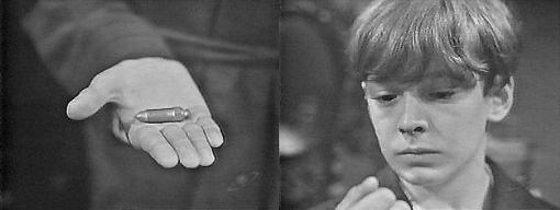 In her room, Vicki is getting dressed when she sees her doorknob turning. She quickly opens her door and finds David standing there. He immediately runs away, into his room, and hides something under his pillow, then goes to stand by his desk Vicki enters and asks what it is this time--another present? She faces him and says she doesn't want to have to lock her door every time she goes out. You can lock it, he says, I don't care. But I do, she tells him, aren't we friends anymore? What did you tell em father? he asks. It had nothing to do with you, says Vicki--we talked about the accident, nothing else. (Isn't she putting anything together here? This kid is acting as guilty as Capone, for God's sake! And even Roger said a child could do it!) Is he going to call the police? asks David. Maybe, says Vicki--why should that bother you? (Why, indeed?) I just wanted to know, that's all! says David. Why are you so worried and upset? asks Vicki. Where are you going? David asks her. Into town with your father, she says. To the police? he asks. Maybe, I don't know, says Vicki. David walks away from her. How can we be friends if you won't tell me what's wrong? asks Vicki. I don't wanna be friends, he says. All right, she says, we'll talk about it in the morning. I wrecked the car, he says. WHAT? she asks. One of my models, he says, I crushed it and threw it out the window. That was a silly thing to do, she says. Why don't you call the police and have me arrested? He asks. Because it's easier to buy you a new car, says Vicki. Why can't HE buy a new car? demands David, why does he have to call the police? I think you're just too young to understand, says Vicki I understand, all right, says David resentfully, I know... Roger has entered the room, reminding David that he told him to go to sleep. It was my fault, says Vicki, we were having a little talk. Can't it wait until morning? asks Roger, I was wondering what had happened to you. He was very upset, says Vicki. He'll be more upset if he's not asleep in 10 minutes, says Roger--now get in that bed right now! David does so, kneeling, not lying down. Don't you glare at me, young man, orders Roger, I'm in no mood for your nonsense!--are you ready? He asks Vicki. I just have to get my coat, she says. I'll meet you downstairs, please hurry, he says. Vicki gives David a sympathetic look and tells him to try and get some sleep--good night. I hate him, David says, crouching on his bed. Vicki looks at him helplessly and sighs, not knowing what else to say, and leaves his room.