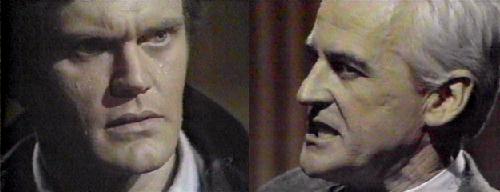 Lang slams the door after Julia's departure and turns to Jeff. You're three hours late, grouses Lang, and picked the worst possible time to come in. Jeff apologizes. Lang wonders what Julia thought, seeing Jeff, and Clark reveals his meeting Vicki and Julia at the cemetery. Lang asks if they saw him digging, and Jeff said no. What were they doing at Stanhope Cemetery? asks Lang, but Jeff says he was at Eagle Hill, not Stanhope. Lang asks why he went to Eagle Hill instead of following instructions. Jeff understood his instructions. There hasn't been a burial at Eagle Hill for 50 years, says Lang, but Jeff has no idea why he went to Eagle Hill--he started walking and that's where he ended up. Lang is pissed he came back empty--handed, but Jeff refuses to go out again. Lang insists. I don't want to do this, it's wrong, protests Jeff--when I saw Vicki tonight, I felt rotten and sick--and ashamed. Lang asks if she knows what Jeff is doing, and he says it doesn't matter--she's a decent person who respects him, and he wants to keep seeing her, and he can't unless he stops this. Lang says not to worry--he won't be seeing Vicki anymore. Try and stop me, challenges Jeff. Lang warns him that if he intends to interfere in his plans, seeing Vicki--I won't have it! Jeff wants to know what Vicki has to do with his plans, and Lang tells him Barnabas wants to marry Vicki, and he doesn't want Barnabas to be unhappy. Jeff doesn't care about Barnabas' happiness. (no wonder I don't like this schlemiel!) Jeff wants Lang to keep away from Vicki, but the doctor orders him to get to the cemetery and get the job done.