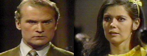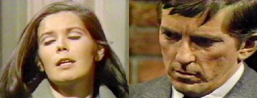 He belongs to the past, says Barn, but Vicki says she believes Peter came back with her in the person of Jeff Clark. She's seen him several times and believes he's Peter. Impossible, maintains Barn. I came back to the present, why not Peter? Asks Vicki. Barnabas patiently explains this is her time, now, she had to come back because she belongs here--Peter stayed in the past. Vicki isn't sure, and until she is, she can't make any plans for her future--their marriage ain't gonna happen; her feelings have changed a great deal. "I can't marry you, Barnabas," she says, and he looks bereft and miserable.
