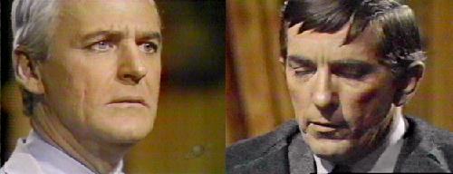She thinks he should tell her, but he reminds her that HE is Barnabas' doctor, and Barnabas will remain his patient after he leaves the hospital, says Lang, because Barnabas knows only he can help him. Julia observes Lang's confidence in his plan. I want to help you, she says--Barnabas isn't sure he's ready to cooperate, he doesn't know Lang well enough; Julia could erase those doubts--he trusts me implicitly, adds Julia smugly. (since when?) If she thinks his plan a sound one, she can guarantee Barn's cooperation. Lang wants to know why the intense interest in Barn's welfare. He's been my patient, points out Julia. Is that the only reason? asks Lang. Yes, she replies defiantly. Sooner or later, she'll find out what he's up to, Julia swears, and if it's detrimental to Barnabas, I will do everything in my power to stop you. He thanks her for the warning and bids her good night. As she's leaving, Jeff Clark bursts in. She stares oddly at Lang and says goodnight to him, obviously very curious about the connection between these two.