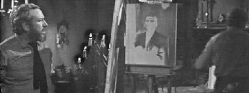 Maggie visits Vicki at Collinwood and they discuss Barnabas' European ways and admire his portrait. Maggie comments about the eyes in the portrait and how PENETRATING they are, and this segues into Barnabas himself, sitting patiently, hands crossed on his cane, posing for Sam. The cock crows--it's dawn! Sam catches a line on Barnabas' face that he missed and insists he must add it to the portrait.