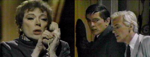 The men pound on the door and Lang holds the gun on the closed doors. Julia gets a busy signal from the Collinsport police, and dials the operator, asking frantically for an emergency number for the cops. Connected to Collinsport's finest, we have the scene I mentioned above as Barnabas tells Julia not to get the police involved. "Remember Dave Woodard," repeats Barnabas as Lang feeds him the name. Julia does remember and slowly hangs up the phone.