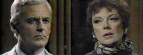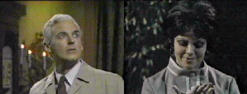 Later, on the terrace at Collinwood, Julia tells Barn he can't consider Lang's offer to put his life force into that monster and bring it alive. Barnabas says he won't be a monster then, unless Julia considers HIM one, which he is sure she does. She denies that, she wishes she did, then she could simply let him do it. Barnabas insists he had no choice. You do for the first time, says Julia, you aren't a vampire now. Barn says the cure isn't permanent, he finds himself regressing, and afraid. Julia says she and Lang can control that, but Barn reminds her about Angelique--she won't let him escape the curse! She's done nothing, says Julia. But she will, predicts Barn, when she's done enjoying herself, when she thinks he's suffered enough, made him feel fear--he can't live this way! The only way to catch her, says Barnabas, is to catch her in the crossroads at the dead of night-if he goes along with Lang's plan, he'll escape Angelique forever, be a stranger to her. As they speak, Cassandra is at the gate, listening to their conversation. Julia asks if he feels there's any chance for Lang's plan to succeed, and Barnabas reminds her she told him the doctor was brilliant, but THIS, says Julia. Barn says he trusts Lang, and Julia says he does so only because he's desperate. Barnabas wants to live a normal life with ordinary fears that everyone has. Is that asking so much? Julia thinks he must want to die then. At this point, Barnabas spots Cassandra, watching them. Barnabas denies wanting to die, and Julia plies him with other questions--even if it works, where will he live? How? He won't be able to return to Collinwood--what will he do? There's a great deal to be decided, agrees Barnabas. He'll leave his wealth with Julia (that's nice!) Still speaking, he begins circling around the gate. She will keep it for him, but there's something far more important to do tonight. He grabs the eavesdropping Cassandra. "We have a visitor, Julia!" cries Barnabas triumphantly, holding her tightly imprisoned in his grip. Cassandra, wearing a much nicer wig now, struggles against him--she was just taking a walk. Barnabas demands to know how long she was listening, what she heard, and Julia chastises, "Barnabas!" Cass begs him to let her go, insisting she doesn't know what he's talking about. "You're lying, Angelique!" Barnabas shouts, still clutching her. She orders him to stop calling her that, and he says she won't upset their plans, he'll see to it. "Why do you keep accusing me?" demands Cassandra. "Why do you think I hate you? Julia, why does he? He's mad. Everyone says Roger is, but it's Barnabas who is insane! I'm the only one who knows it--I'm the only one he treats this way!" "YOU KNOW WHY!" thunders Barnabas, but Cassandra cries, "No, I don't!" and pulls herself from his grasp, sobbing. Julia tells him to let her go or make it worse. Barnabas says they're fools to be there, discussing their plans, which Cassandra will ruin if she knows of them. Another reason you must not do it, says Julia, but Barnabas insists they must escalate their plans. Upset, he races off, leaving Julia alone on the terrace, crying, "No, Barnabas, no!"