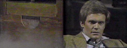 Maggie finds Jeff out in the living room, reading. He asks if Vicki is really as good as he thinks she is, and Maggie says yes. Maggie expresses her opinion that Jeff isn't used to being in love, then says goodnight. Jeff thanks her. He falls asleep in the chair and has the dream! (I don't want to put in every detail of these dreams, but suffice it to say that Jeff's doorknocker was Lang, door #1 contained the skull, and door #2 contained a guillotine, which dropped when Jeff opened the door.).