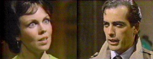 Hypnotized, he says he can hear her. She tells him to sit down; he does, gazing up at her. She needs his help again--he's Julia Hoffman's lawyer, and Cassandra has reason to believe that woman is interfering with her plans, trying to prevent the dream curse from reaching its intended victim. She describes the dream curse to Tony. Julia had the dream and hasn't yet told it to Mrs. Johnson, and Mrs. J. can't have it unless Julia tells her about it. She asks Tony to watch Julia carefully, where she goes, who she sees, what she does--don't do anything to her, but find out why she's resisting. Tony agrees. One more thing, says Cassandra, forget I had anything to do with Lang's death. He promises to forget; she gazes fondly at him and brushes her fingers across his forehead. He comes out of the trance, but is confused by her interest in him--she's a married woman and they shouldn't be seeing each other alone this way. But you ARE seeing me, she points out, but he doesn't understand why--she has a strange effect on him. It's obvious, she pronounces--you're falling in love--with me. He looks at her, and they come together in a nice, juicy kiss--which is witnessed by David! They kiss again, clutched in each other's arms, and David turns away from the upsetting sight.