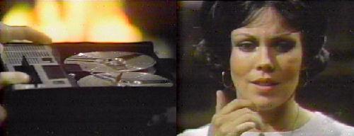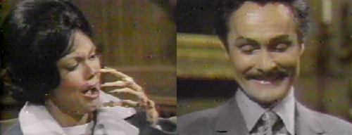 She says she isn't in the mood and again tries to send him up to bed. David dejectedly heads upstairs, then, on the first step, turns and asks her if she knows very much about Barnabas- does she know what his "affliction" is? This catches her attention, and suddenly, she's very anxious to hear this tape. She drags him into the drawing room, and he's surprised at her abrupt change of mind. She tells him to hurry, she wants to hear the tape. It's about two minutes to nine now. She hears the music, and listens impatiently, telling him to speed up the tape to get to the good stuff. She listens to Lang's voice, hears what he has to say about Adam and Barnabas, and realizes this is her get out of jail free card.