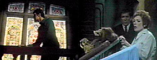 Barnabas returns to the Old House, looking dazed. Julia comes downstairs and asks what happened. He doesn't answer right away, and finally tells her he's all right. Nicholas is gone, he says, stunned--he just disappeared, in a blaze of flames on Widows' Hill--I followed Nicholas there, who was calling someone who must control fate--he was begging, pleading, not to be sent back to where he came from--then he burst into flames. Has he disappeared forever? wonders Julia. "Yes," says Barnabas, "Nicholas is gone!" Julia repeats "Nicholas is gone!" several times and hugs Barnabas, thrilled the danger is over. He pats her back, as relieved as she is.