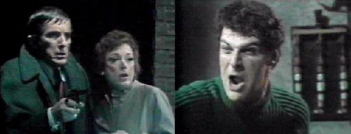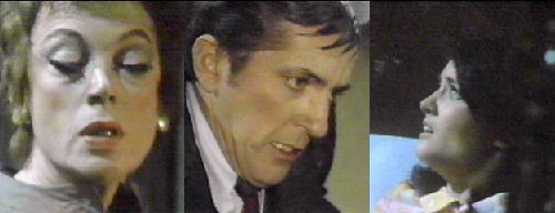 Barnabas returns to the Old House, calling Julia. He finds her on the floor, unconscious and revives her. Adam's in the basement, doing something, she doesn't know what. Barnabas tells her Adam has Vicki down there, he kidnapped her--we must get to her before Adam kills her! They both hurry to the basement door, wondering what Adam is doing down there. In the basement, Vicki lies strapped to the other table. She stirs and moans as Adam turns on the power, sending electric shocks bolting through Vicki, who writhes and wails. Barnabas and Julia hear the sounds. Barnabas calls to Adam. (Here is the nose pick blooper, but the less said about that, the better.) "It's no use," says Julia. Adam turns up the juice, a sick smile on his face, sending Vicki into even more intense pain. She begs Adam to leave her alone, please, please! Adam hears Julia begging him to leave HER alone, and he covers his ears. He fiddles with the dials, now hearing Carolyn begging him to leave Vicki alone. Adam smacks his head as though trying to force those voices out. Vicki screeches as the electricity and pain escalate. Adam looks at the skeleton. "That was Eve!" he cries. "You were to be mine, look at you now! This is what they did to you--Barnabas will suffer for this!" Barnabas, holding a gun, and Julia enter the lab. "Adam!" cries Barnabas. "Turn off that machinery or I will kill you!" Adam, clearly insane, laughs. Barnabas reiterates that he won't hesitate to kill him. Adam chortles, "Do you know what will happen if I die?" Barnabas knows, but he is willing to take that chance. "You'll revert back to what you were!" rants Adam, and this causes Barnabas and Julia to exchange significant glances. Adam repeats what he said--that's what was on Lang's tape. Barnabas accuses him of lying, but Julia says he might be telling the truth--Adam has heard the tape.