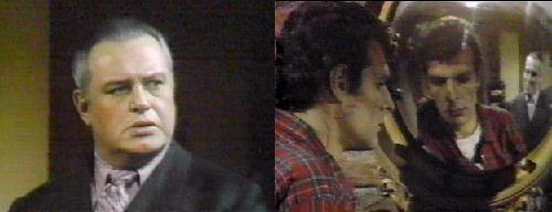 Adam, gazing at his reflection in a mirror, says he can't--he's too ugly. That's simple of remedy, says Stokes--nowadays anyone can make himself handsomer if he wants to--I know a clinic, and if you don't like the old Adam, they'll make a new one! I need a project, says Stokes. Someone rings the doorbell. "Barnabas?" asks Adam. No, it's Jeff. Adam begs him not to let him in, because of his tie to Vicki. Stokes considers, then orders Adam to stay in the bedroom. Stokes calls to Jeff, "Just a minute!" After Adam hides, Stokes lets Jeff in, who tells him, someone picked up your phone but didn't say anything. Stokes suspects his home is haunted, but he's never in his reading encountered a ghost who used the telephone (this is prophetic, given what will soon happen). Jeff says someone was there, he heard breathing. Wrong numbers, says Stokes--I was out finding the herbs I told you about. He opens a packet and shows Jeff, telling him he advises against this. You promised to help me, Jeff reminds him. Stokes admits he is having second thoughts--the herbs can be dangerous, and mysterious things could happen. I need that, insists Jeff. Trapped between curiosity and knowledge, says Stokes, and suggests he discuss this with Vicki. The herbs can help me remember if I'm using Jeff Clark's body, but am really Peter Bradford--I need to know more, like how I came to this century-- then I could go back to my own (please, GO!). Stokes advises him to marry Vicki and consider it an unusual marriage--but most are, in one way or another. When Stokes' back is turned, Jeff munches some of the herbs. Stokes catches him and demands to know what he's doing--you must do it by the ritual, the only way it can be controlled, protests Stokes--you might have spoiled it! He orders Jeff to sit down, turns off the light, and lights a candle on the table. Say nothing, orders Stokes, when I pause, you will eats the second leaf, another pause, another leaf. Stokes sits across from him and speaks some mumbo jumbo about our true nature of this Pilgrim who seeks his past, to see the first land he knew. . . Jeff eats another leaf. Guide him through the years, intones Stokes, until he finds his own time. Know that he honors you, that he believes in you, that he will not defame you. Stokes asks Jeff his name, then asks if he can write his name. Jeff takes a pen and writes PETER BRADFORD. He drops the pen.