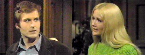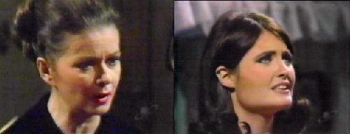 He agrees. Carolyn says the animal who killed the girl is definitely the same one Liz saw--that the animal broke through a window to get to that girl. . . Chris appears to not be listening, but he says he's more upset about the girl even than Carolyn. He didn't know her, but. . . Carolyn comments that he's difficult to figure out. Chris wryly advises her not to try. She asks if he's challenging her. Chris starts to leave again--I forgot--I was supposed to stay. She finds him both rude and mysterious, and asks why he doesn't want anyone to notice him. Liz comes in asking for Julia. Vicki is hysterical, clamoring, "You should have let me!" Liz and Stokes help her upstairs, Liz assuring Vicki it's going to be all right. (Stokes is really nice to be of such help.) Carolyn asks Stokes if the animal attacked Vicki. No, says Stokes, who is standing on the bottom stair--she was attacked by fate, that's all.