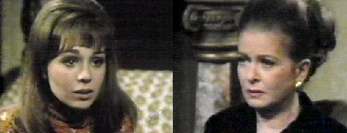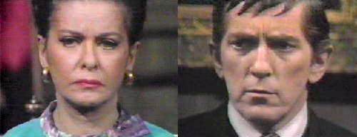 8:10 PM - Collinwood - Stunned, Barnabas and Liz, together in the drawing room, go over what just happened to Vicki. They wonder how it's possible--one moment she was there, the next moment, gone. They'll never understand it, they agree. It's like death, mutters Liz--we don't understand that because we can't, we can only wait for it, knowing it will reach out for us when it's ready. (oh, no!, not this again) Barnabas, perturbed, reminds her they have both had a great shock. Vicki didn't die, muses Liz, she simply vanished into another time--that's where she'll die, where she's supposed to die. Barnabas wants to bring Liz upstairs and find Julia, get his cousin some rest. My time is near, too, and I'm going to die, says Liz. Barnabas slips an arm around her and guides her out of the room, his face creased with concern (nice of you to leave him with all these problems, Roger!)