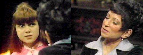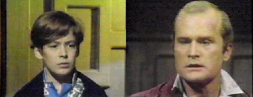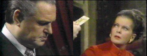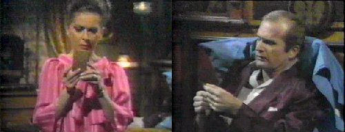 She shows it to Roger--why is it there? It wasn't there earlier, says Roger--something is happening in our house (and this is different from what day)? She gazes at the card. Roger sees no connection between the two, but Liz isn't so sure. You can tell fortunes with the Tarot, and each card means something, I read that, says Liz. Roger accuses her of imagining things, but Liz says ever since the seance--someone was speaking through Carolyn, trying to warn them. That I would trip on a wire? asks Roger skeptically--Iwish you'd told me; I wouldn't have gone downstairs. (love this droll man1) David comes in; Amy woke him, he says. She shouldn't have, says Roger. Liz leaves to check on Julia. David asks to stay with Roger for a little while, expressing concern about his father's fall. Roger assures him he's all right--just bruised a bit, that's all. David asks if there's anything he can get him--was a burglar in the house, as Amy said? Amy's imagination, says Roger, and he stands up to prove to David he's perfectly fine. He limps to the brandy, cradling his back, which David notices. Roger asks why the concern--I'll be all right in the morning. David hugs his father, saying how glad he is. (false, false, false? Or does David really feel bad?!)
