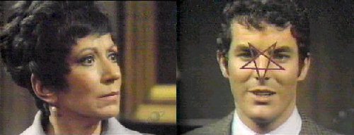She is horrified. It fades away. Joe looks in a mirror and sees nothing. He asks Amy to go find Mrs. Stoddard; he wants to see Mr. Collins. Joe tells Madame F that Amy has quite an imagination. She informs him SHE, too, saw the star--it's a sign of the pentagram, she says--don't ignore it. Joe has no idea what a pentagram is. She explains that it's an ancient symbol of either a good or bad omen, depending on the star's position. Joe observes his must have been bad, and Madame F, perturbed, warns him to just be careful--watch out for an animal that walks as a man. Joe says he's lucky--there aren't many of those around here. Liz comes in and tells Joe Roger would be delighted to see him. Madame F asks if Amy can show her to the West Wing, but Liz says Amy isn't that familiar with the house (HA!) As Liz leads Joe out of the room, they discussing Roger's accident. (What happened to the fact that Joe tried to kill Barnabas? Has all been forgiven?)
