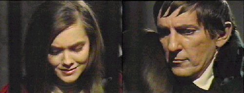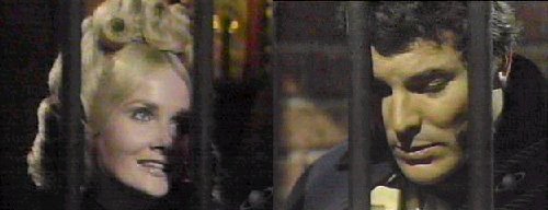 We have a new Vicki, one who looks much like Alex Moltke, and even more like future DS star Kate Jackson. Barnabas appears in her cell, touching her hair. She's stunned to see him. He tells her he's come back. That's impossible, you're dead! insists Vicki. He tells her not to be frightened--I'm not dead. Josette told me you had died, she says. Everyone thought so, he says, but I was put under a spell by Angelique. Then you know Angelique was the witch, says Vicki. Yes, I learned soon after we were married, he replies--I planned to tell the authorities, but she stopped me by putting me under this spell. How was the spell broken, she asks. I don't know, he says--I've got to help you now. She asks how he got into her cell and he explains the jailer let him in while she was sleeping. He's holding her hand. She tells him they're hanging her tonight, and it can't be stopped. Barnabas says I returned to stop them--and I will. I know I should be grateful, she says--you he won't be able to understand this, but so many things have happened since I last saw you. Barnabas doesn't care--you're in trouble and you aren't going to die. Listen, she pleads--there's someone else, a young man you don't know. I know more than you think, he assures her, and names Peter Bradford--Ben told me everything--I know how much Peter means to you. Peter's going to die on the gallows soon after I do, she says. Neither of you will die, promises Barnabas. I returned to my future time for a while, then realized I couldn't live without Peter's love, says Vicki--that's why I was willing to come back to the past, to be with the man I love--in death.
