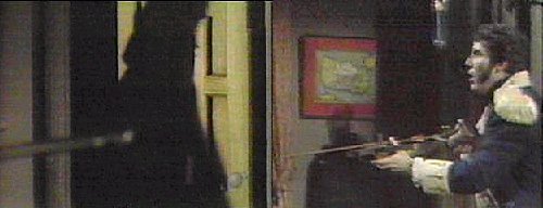 Forbes tries out the crossbow as he did the first time around, leaning against the door, backing off, aiming at it. It works. Barnabas checks the clock and heads for the study. Nathan is poised with the crossbow and arrow, waiting for Barnabas to come to the door. Barnabas arrives. Forbes aims. The door opens; we only see Barnabas' shadow, then nothing!