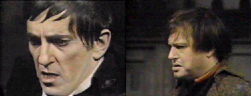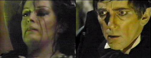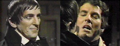 If you need my help that desperately, points out Nathan cagily, you can't afford to kill me--I don't want to go to jail, so we should agree on a compromise. Barnabas once again grabs Nathan's throat, telling him there will be no compromise--he'll write and sign the confession! Nathan agrees, too easily, then tells Barnabas HE must do the same--your sins look pale beside mine, and I want everyone to know what you are--if you won't reveal it yourself, I will. They parry a bit, but Nathan believes Barnabas won't kill him if he wants to save Vicki and Peter--he has weapons of his own, and he won't sign anything until he knows what his own fate will be. Barnabas assures him he can take care of him without resorting to killing him, using the powers he has now--you can't dictate to me--you're a pathetic fool if you only think killing is my answer. Nathan grows nervous, asking why Barnabas is staring at him like that. "Keep away from me!" cries Nathan, but Barnabas, fangs bared, attacks him as Nathan screams.