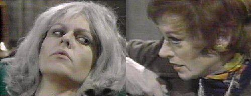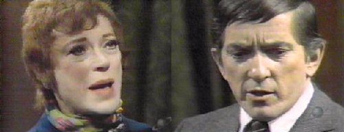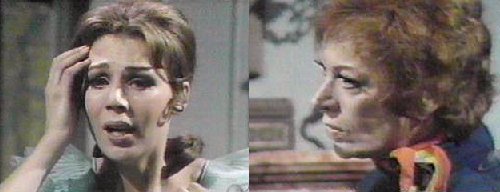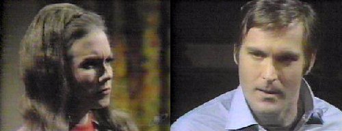 He presents her with the dress, which she recognizes--it's not mine, she protests, I don't want it. He advances on her. She begs him to stay where he is. He pulls her close and kisses her, a real nice kiss, then grins at her. (so cute!) He laughs, shoulders shaking, then his face blurs. Maggie sits up suddenly, then races from the room, calling to Julia. The latter joins Maggie in her room. Where's Barnabas? Asks Maggie--I just had a dream and saw Quentin's face again--I saw the room where he took me the night before last, but can't remember where it was--it seemed he wasn't with me, I was drawn somewhere--I remember something else--the minute I woke up, I saw two images in my mind--first, a dark, long old staircase; the second was Mrs. Stoddard's room--I need to put the images into some sequence. Julia agrees she should try--remember the night before last. I followed Amy to Collinwood, begins Maggie, to the drawing room--I was staring at something behind me, and I turned around--Quentin was there--he didn't hurt me, he just kept smiling at me--he took me somewhere, up the old staircase, after that, I was in Liz' room, alone--I felt as if Liz' room was mine--I didn't leave the room, I was pulled someplace else. Where? asks Julia. Maggie recalls walking down a long corridor in the West Wing, standing in front of a door, still alone--but I knew someone waited for me beyond the door--I went inside, but I can't see that room clearly in my mind--when I first walked into it, I thought I saw the figure of a man, and I thought, he's caught us--I remember it wasn't a man at all, but a tailor's dummy with a face painted on it--Mr. Jughans!--I remember the room I was in--a storage room in the West Wing, and there's another room next to it, where I'm sure I'll find Quentin, and David!