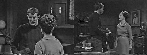 Liz hangs up the phone and tells Matthew that Mr. Collins didn't answer; she left word for him to call--I want to talk to you before the police get here--why don't you sit down? I'm more comfortable standing, he says. Liz sits down on the sofa. How could you have looked at the body of a man you'd know all your life and do what you did? she asks desperately. He was dead, says Matthew, it didn't matter to him. It doesn't seem possible, says Liz--how could it have happened? I looked him over careful, says Matthew--to the best of my knowledge, it looked like he had drowned. Could it have been anything else? asks Liz. I've seen drowned men before, Matthew reminds her. Poor Bill, laments, Liz, hr always was afraid of the water. Because he couldn't swim, says Matthew, sounds funny, a man running a fishing fleet, an old time fisherman himself, not being able to swim--but there's lots like that--they trust in St. Elmo to bring them home safely. St. Elmo brought Bill home, says Liz sadly, but not safely--you should have pulled his body out of the water and called the police! I wasn't thinking of myself or Bill, says Matthew, but Collinwood--if the situation had been revered, and it had been Bill Malloy that found me dead, he'd have done the same thing. I don't understand, says Liz. Remember what I told you about what would happen if Miss Carolyn and Miss Winters thought they saw a body, or even a hint of one? asks Matthew--think of what it would be like if t'was known there really was a body down there. Liz rises from the sofa, saying you can't hide a thing like that. Why not, they'll find him somewhere up the coast, says Matthew, where no one can say Collinwood caused another death. You're sure he drowned? Asks Liz. Matthew nods and says I believe so. But where? asks Liz--not on Widows' Hill, not here! I'd say not, says Matthew, looked like he'd been in the water at least 24 hours. How do you know that? she asks. It's not a pleasant thing to discuss, says Matthew--there are ways. (Fish must have feasted hearty.) Liz wanders around the sofa, clasping her hands together, sadly digesting all this. What do you want me to tell the police when they get here? asks Matthew. The truth, says Liz quietly. Everything? He asks. What do you mean? Liz asks. I don't think too quickly, he says--if you want me to tell them in any special way, you'd better coach me in advance. Tell them the truth, instructs Liz--you have nothing to hide, there's nothing you know about. Yes mum, he says. Are you positive he drowned? Asks Liz. You keep asking that, says Matthew, do you expect he might have died some other way? No, she says. I wasn't really questioning you, he assures her, but I was thinkin'--those are the questions the police are going to be asking. You're right, she says, and not just the police--but Burke Devlin--he'll have a lot of question to ask. Mebbe, he says
