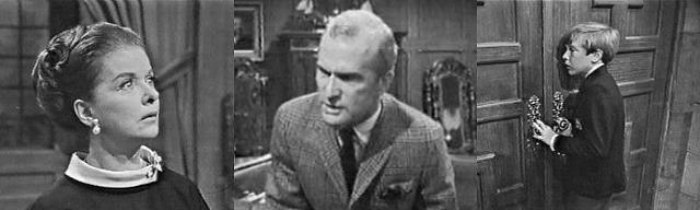 Liz and Roger are seated in the drawing room. Patterson says the one thing he doesn't understand is what Burke Devlin would have to gain by lying about the purpose of that meeting--would you know, Mrs. Stoddard? I have no idea, she says. Well, says Patterson, I have two stories here, Burke's and your brother's--each exactly the opposite. There's a third man involved, says Roger. That's true, says Liz, have you questioned him? Yes, says Patterson, and he said exactly the same as Roger--he had no idea what the meeting was about. That should settle it, insists Roger, wouldn't you say? I wish it were that easy, says Patterson--poor Bill, if he knew what his drowning was stirring up. Nothing is being stirred up, says Roger, rising from his chair--don't you see that?--it's only what Burke is doing. It's enough, opines Patterson. Burke has never forgiven me for testifying at his trial, insists Roger--he would do anything to cause me as much anguish as possible--his story is completely false! All right, says Patterson, thanking them--I'll be in touch, he says. Roger volunteers to see him to the door. Liz tells her brother she wants to see him, and Roger says in a minute--to Patterson, he says, you were involved in that investigation that led to Burke's trial--don't you know whether he's guilty or not? (Was it Patterson or Carter? They are two different lawmen, right?) That's part of my problem, says Patterson. David joins them in the foyer and asks the sheriff, "Aren't you taking him with you?" Patterson chuckles and asks who. Go upstairs, Roger orders his son. That's all right, says Patterson, a hand on David's shoulder--did you think I was going to arrest your father? Yes, says David. I was thinking of it, says Patterson, but he kind of talked me out of it--what have you got there? A chart, says David--it shows exactly where Mr. Malloy's body went into the water--here, I made it for you. He hands it over to the sheriff, who thanks him and says he'll take it along to the office and study it--that's quite a boy you have there, Mr. Collins. Yes, agrees Roger. Patterson says he'll be in touch and suggests to David that he keep up the detective work, then leaves. Roger and David exchange ugly looks, walking in opposite directions, and the father turns back to gaze at his son, who looks back stoically.