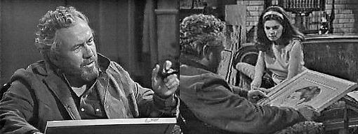 Cottage - Sam smokes his pipe, telling Vicki what an interesting story that is--he had no idea she was searching for a family. Yes indeed, says Vicki. How do you like that? asks Maggie, carrying in a tray, she doesn't know when she's well off! I trust you were joking, says Sam, and Maggie laughs and kisses him--dinner will be ready in 15 minutes, she tells them, and returns to the kitchen. I'm glad you're here, says Sam to Vicki, it's been rather trying here for her these past times--she hasn't been laughing like she used to lately--how can I be of help to you? It's about this painting, says Vicki, handing it to him--do you remember who the model was? He takes it and gazes at it, then says it is an old one--not bad, pretty good, he remarks--amazing how your brush stroke changes in 25 years. Is that how old it is? asks Vicki. Far as I can recall, somewhere in the vicinity of...you know something, she looks a bit like you--or rather you look a bit like her, especially around the nose and mouth. That's why I want to know who she is, says Vicki. I know she was a local girl, says Sam--Hansen--no, Betty Hanscomb
