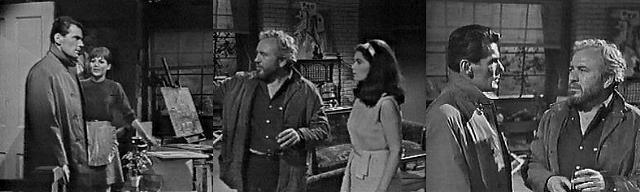 Maggie, Vicki holding the door open, enters the cottage, arms laden with packages. She warns Vicki that he father's an artist, so don't expect everything to be neat. Vicki promises to be prepared for the worst. Maggie looks around and decides it's neither the best nor the worst, but somewhere in-between. She sets the packages down on the art table and calls to Pop. It's charming, says Vicki. It's all right if you like palettes in your chairs, laughs Maggie, removing one--and an occasional paintbrush in your soup--make yourself comfortable--I'm going to rouse Pop and tell him we have company for dinner She exits. Vicki takes off her coat and hangs it on a hook by the door. She glances at a painting on the easel. Maggie comes out and says he's not home--they'll just have to surprise him. Did your father do all these paintings? asks Vicki. Every blessed one of them, says Maggie--he's pretty good, isn't he?--you'd better say yes. I think he's wonderful, says Vicki. Now I know we're going to be friends, chuckles Maggie. Vicki grins at her. There's a pile more over here, says Maggie, why don't you look through them, while I unpack these groceries. Let me help you, says Vicki, and Maggie, lifting up both bags, says she won't keep her from admiring her father's paintings--he'd kill her! She returns to the kitchen as Vicki looks through the paintings. She picks one out and holds it in better light, then at her own reflection in the mirror. She begs Maggie to come out now--this is really important!