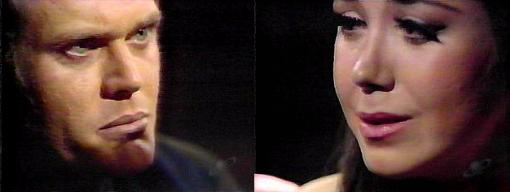 Collinwood drawing room - Amanda hears a door slam. She pulls open the doors eagerly. It's Quentin, who realizes--you thought I'd be someone else--not the honorable Mr. Trask, I hope. She shakes her head. Tell me, he encourages--they don't have any secrets at Collinwood. (HA!) Mr. Tate, she replies. No, he's not for you, objects Quentin, smiling, he never enjoys himself!--you want someone who knows how to enjoy himself. He puts on his music. I played it earlier, she explains--a madwoman stopped me, insisting it was your song. He bows--may I have the pleasure of this dance? he asks. I shouldn't, she says. Don't you dance? he asks. I do, says Amanda. Then you have no excuses, he says. She moves into his arms. They begin to waltz. That's a pretty melody, she comments. I want to think of new words, happy words, he says, so every time I hear it, I think of you. Don't make them too happy, she cautions, tell me the ones you know now. He recites: Shadows of the night, calling silently, echoes of the past, calling you to me. Haunting memories, veiled in misty glow. . . At this point, they kiss. Trask catches them in mid smooch.