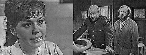 Would you be willing to get up in a court of law and swear that under oath? asks Patterson. No, says Sam, she wouldn't, she doesn't really know. How can you say that? demands Maggie--you don't know how I check up on you all the time! You don't have to perjure yourself for me, insists Sam, besides, I don't need it--I didn't do anything I can't account for. Then you don't know what time your father left the house? asks Patterson. No, she doesn't, responds Sam--but I do--it was 10:30--I walked around for a while, trying to make up my mind whether or not I should go to the meeting. And then you finally decided? asks Patterson. Obviously--I was there, points out Sam. But Malloy wasn't, says the sheriff. He had an accident on the way, that's all, says Maggie defensively. Patterson explains that all he's trying to do is collect all the facts he can to present to the coroner. Yes, sir, she says, you have the facts, sir, so present them! (This gal's a pistol!) Don't be fresh, darling, says Sam. I'm not being fresh, says Maggie, I'm scared! There's nothing to be scared of, says Patterson. No, she says, then maybe it's not you I'm scared of. Burke Devlin? asks Patterson--don't let that worry you--he talks a lot, but I'm still the law in Collinsport--he checks his watch--and I'd better get back to my job--he leaves. Sam sits at a table. Maggie sits with him, asking what it's all about. I can't tell you, he says. Can't or won't? she asks. I don't know anymore about it than you do, he says. Would I know more if I read that letter you put in the safe? she asks. No, says Sam, the letter has nothing to do with it. It must say something that would help you, she says. Help me? he asks, what are you thinking could help me? Pop, that's what I want to know--what sort of help you do need, she asks. None, he says, the letter was nothing more than my last will and testament, that's why I said it should be opened if anything happened to me--it's my will, leaving you all my worldly possessions. You said it was life insurance for you, she reminds him. That's the same thing, he says, I should have said it's life insurance for you. She goes over to him and puts her hands on his shoulders. You know that I love you, don't you? she asks him. I hope so, he says. Then you don't mind if I don't believe you? she asks. No, I don't mind, he says---no reason why you should (a very touching scene).