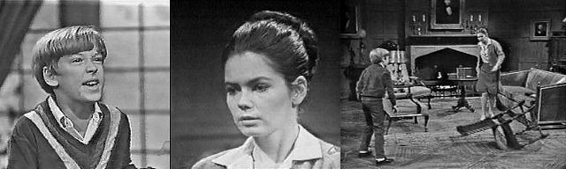 You must be mistaken, Vicki tells David, dropping the history book on the sofa--why would your parents be arguing about Burke Devlin? They weren't arguing, David impatiently explains, they were fighting! That was a long time ago, she says. I was six years old, he says, old enough to remember--it's like it just happened--from the minute I met Burke, I remembered the whole thing! I don't want you to repeat what you just told me, says Vicki, to anyone else--it could make serious trouble for Burke--and you like him, don't you? I sure do, says David with enthusiasm, he's my only friend in the whole world--do you like Burke? Yes I do, she says. Does he like you? asks David. Vicki says you'd have to ask him that--right now, I don't think he thinks very much of me. Why, what did you say? he asks her. I had to say something he didn't like, she says--because it was the truth. So you had to go and make trouble for Burke, accuses David--why couldn't you just keep quiet? Because it could have hurt your father, she says. Who cares? he asks. You don't really mean that, she says. I do, too! he says--you know what you've got?--a big mouth! (Nervy little SOB, but I still feel sorry for him). Don't be rude! she orders. I'm not being rude, it's the truth! he says. David, I'm getting sick and tired of your nonsense! She reaches out for him, and he backs away, ordering her not to touch him--I was wrong before, you ARE a stranger, a stranger trying to make trouble for me and Burke! That's not true, protests Vicki. It is, too, he insists--if Burke hadn't stood up for me, I'd have gotten into a lot of trouble!--that's all you want to do is get me in trouble.