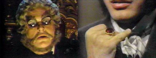 Petofi laughs, nodding, then says, it was exceptionally bright of you, very intelligent, yes, Quentin, Lady Hampshire and I have met--surely she forgot. No, you know each other very well, says Quentin--am I gaining some second sight? Would you like that? asks Petofi. Quentin asks, is it because of the ring? How suspicious you are! says Petofi. Yes, agrees Q, I'm becoming suspicious, it's as if I feel I'm about to remember how you and Lady Hampshire knew each other, as if, any moment, I'll know it--"You said once that I would have to pay for the portrait," recalls Quentin. "My portrait. Is this part of the price?" You will never know, Quentin, what you have to pay, says Petofi--you were very careless about that portrait, my boy, very careless indeed--dangerous to lose anything so valuable, if it fell into the hands of an enemy and the moon was full, one slash of a knife across the portrait and you would be as you were--"you should be more careful when you deal with"--and he goes to the door--"the unknown!" The only thing I'm certain of, says Quentin, is that you are the unknown--what do you want from me? Aristede brings out Quentin's covered portrait, a move Petofi calls clever--you must have known we were talking about this. Petofi shows Quentin the portrait. Q demands to know, where did you get it? That doesn't matter, says Petofi, I don't want you running in a rage to chase whomever stole it--no, I looked out for you, just relax and don't interfere. Look at that face, says Quentin, every time I look at it, it looks uglier and harder. It's your imagination, insists Petofi. Look at the shadow under the eyes, suggests Quentin--it wasn't like that when Tate first painted it. Quentin looks confused, shaky, dazed. What is it? Petofi asks. My eyes, says Quentin, covering them with his hands--"I can't see!" he cries desperately, covering his face with one hand. Petofi grins. Quentin uncovers his face--I can't see. Turn around, orders Petofi--can you see me? Not very clearly, says Q, I can see an outline. You will see, Quentin, says Petofi, close your eyes and when you open them again, you will see as clearly as Quentin Collins ever could--close your eyes! Quentin does as he's told; Petofi touches his eyes with his magic hand. Now, open them, orders Petofi. Quentin is delighted--I can see--how did you do this?--nothing like that ever happened to me! Don't take it too seriously, says Petofi heartily--that little demonstration was given to show you more of my powers--I advise you to take my advice without argument for once--go back to Collinwood, go to bed, get some rest, you're exhausted, and I need rest--tomorrow morning, everything will be very different--I mean it, it will be! Why do I believe you? asks Q. Because I'm right, says Petofi--not another word out of you--shall I send Aristede with you--would you like company on your way home? (Like he'd really want Aristede's company!) No, I'd prefer to be alone, says Quentin. Yes, I understands, says Petofi. Tomorrow, says Q, we will meet again, to get everything clear as to exactly what I owe you. Tomorrow, agrees Petofi, if you still want to talk, we will. We will, I mean it, says Q. Tell me tomorrow, reiterates Petofi. Quentin goes upstairs. Petofi calls for Aristede and says, it's going brilliantly, far more brilliantly than I dared to imagine--nothing can stop it now--NOTHING!