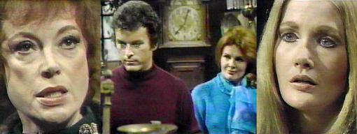 There are things that need to be resolved around here, Julia reminds Barnabas I am aware of that, he says coolly. I may have found a way to help Chris, says Julia. Yes, Chris, says Barnabas, as if he doesn't really give a damn, I assume he's still confined to the mausoleum. No, it was impossible to keep him there, says Julia--I moved him to Windcliff, but he's back here now--but today, I was given reason to believe Tate may still be alive. There's no reason to believe that's true, insists Barnabas, and even if he were alive, he'd be almost 100 and totally useless. We can't assume that, says Julia, annoyed by his attitude, we've got to make sure! Chris comes in to report, Carolyn is with Sabrina--suppose she talks? Chris notices Barnabas--I'm glad to see you, he says--how long have you been back? Earlier this evening, says Barnabas. I still desperately need your help, says Chris. We were just discussing your problem, says Julia. I was just about to give Julia my conclusion, based on my experience in the past, says Barnabas. Good, says Chris, now you can tell me. "I do so with regret," says Barnabas--"in all the time I was in the past, I found no solution for you--I'm afraid there is nothing I can possibly do." Nothing? asks Chris, devastated, exchanging looks with a startled Julia, who says, "but Barnabas, that..." Barnabas adds, coldly "I'm sorry, Chris, I must ask you to excuse me, I'm very tired." He heads upstairs. Julia offers to walk Chris back to the cottage. Outside the Old House, Chris says, Julia, Barnabas couldn't have meant that. Upset, Julia says, I don't know whether he did or not, but something has happened to him--he's undergone a frightening change--"There was no reason for him to lie to ME!" says Julia--he told me he returned to the future the same way he got to the past--via I-Ching--that would mean through the cellar, but that's not possible, since I locked the cellar door from the outside.