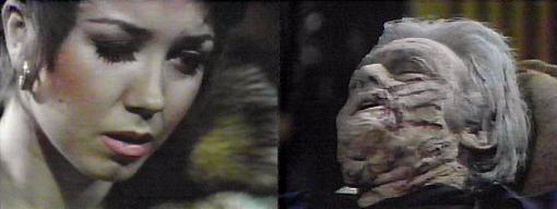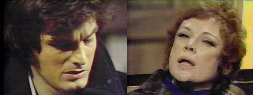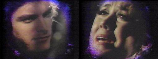 Grant has helped the blood-stained, moaning Tate onto the sofa, and hovers over him. You'll die soon, too, says Tate, I can see it over your shoulder--death, waiting, not fooled because you're young!  (a bad cut here)  Grant comes out and tells Julia and Olivia, Tate isn't going to last long. I'll do what she can, says Julia, you should stay with Olivia. She pulls Grant aside and whispers something in his ear--do you understands? She asks.  Grant doesn't, but says I'll do it anyway. What's wrong with Mr. Monroe? Asks Olivia.  Quentin, outside the door, explains, but I can't hear it. Julia goes in to Tate, takes his pulse. What do you want? he asks.  Where is Quentin's portrait? she asks. It was destroyed, insists Tate. Not true, says Julia, because Quentin isn't a werewolf, so it must exist somewhere--but where?  I'll tell you what you want in exchange for what I want, he says--life, that's what I want--you can't, can you? No, says Julia, I can't. Then there's nothing else I want, gasps out Tate. Yes, there is, says Julia.  She goes back into the hallway and asks Olivia to come in. Julia brings the actress into the room--call him by his first name--Charles, says Julia. Olivia goes over to the ancient, bloody artist, who, upon seeing her, calls her "Amanda--you've come back!"  Olivia gazes down at him, stunned.