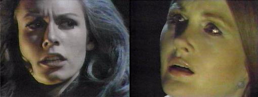This disconcerts Carolyn, who looks around. Just as the moon started to rise, continues Sabrina. Who died? asks Carolyn. A man named Monroe, a painter, explains Sabrina. Spooked, Carolyn says, I don't want to stay here. Sabrina stops her from leaving. What does this have to do with me? asks Carolyn.  Don't you know? demands Sabrina, can't you even guess?  No, says Carolyn, I can't--I'm sorry if this man was a friend of yours. I wish I HAD known him, says Sabrina.  This puzzles Carolyn--if you didn't, what are we doing here? I would have told him, says Sabrina. What? demands Carolyn, what is the purpose for our coming here? Sabrina shushes her.  Carolyn persists--how do you know about this murder?--what do you know about it?  Do you feel him? asks Sabrina--in this room--I do. A wolf howls. Listen, says Sabrina. It's a dog, says Carolyn. No, says Sabrina. I'm getting out of here, insists Carolyn.  No, says Sabrina, not until...  They hear someone else enter the house. Carolyn asks who it is, and moments later, the frightened women realize it's Julia Hoffman, also holding a flashlight. Carolyn is so relieved to see who it is (Julia's definitive shadow on the wall told me who it was), she runs into Julia's arms and hugs her. What are you doing here? asks Carolyn. Sabrina answers, "She's here because she KNOWS." The other two women look at her. I knew the first time I saw Julia that she knows, and has always known, says Sabrina--"You're here to find him--you're helping him, hiding him!" Julia, afraid Sabrina is about to reveal what she's worked so hard to conceal, shakes her head. You know it!--you know, you tell her because I don't want to tell her, you tell her! screams Sabrina,. Julia silences her by slapping her across the face.  (wish I could have had the honor).  Carolyn, take her back to Collinwood, orders Julia. Come with me, Sabrina, urges Carolyn, leading the sobbing woman away. Julia watches them go. Sabrina turns and starts to speak, but Julia says, Sabrina, you can't do anything here--take her to Collinwood, call the rest home, Carolyn--they'll come for her. To Sabrina, Julia says, try not to be upset. Sabrina nods, but she looks extremely upset as Carolyn leads her away.