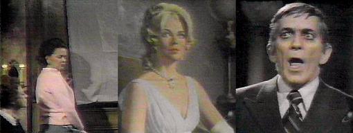 She pulls the cover off the painting and reveals a stunning portrait of..."Angelique!" exclaims Barnabas. Oh, no, says Liz, no one must see it. Let everyone see it--let them remember her! cries Julia. How can anyone forget her? demands Liz, closing the doors on Barnabas.  He futilely bangs on them, calling, "Elizabeth, can't you hear me, why can't I get in that room--let me in! Let me in!" begs Barnabas.