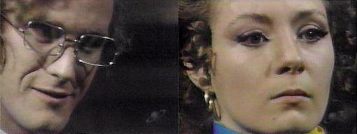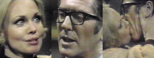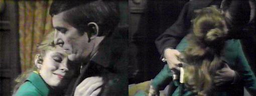 We focus on the TV set in Buffie's apartment (a rare sight). She and Barnabas enter.  I always meant to fix this up more, she says. He admires the picture Yaeger gave her, which is hanging on the wall over the fireplace. Do you really think so? she asks--I don't know if I like it or not, I keep changing my mind about it--someone gave it to me, but when I think of him, I don't like it too much, I guess--but you didn't come here to hear about my problems. No, he agrees. She offers him a drink, which he refuses, moving in closer. Are you sure? she asks.  Buffie grins when he slides an arm around her, drawing her nearer. "You have the strangest eyes I've ever seen, she says, gazing up into them--it's like they can see through me."  She tilts her head, anticipating his kiss, and rests her head on his shoulder.