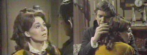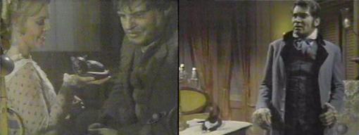 Josette immediately runs downstairs to Barnabas, who spots the mark on her hand. She dismisses it as a bruise. Trancelike, she tells him to stop Jeremiah from leaving. She knows why he's going--he hates her and disapproves of her marriage to Barnabas! Barnabas denies this--everyone loves her! Suddenly, the spell seemingly broken, she falls into his arms. He caresses her hair and professes his love--he'll talk to Jeremiah if it means that much to her.