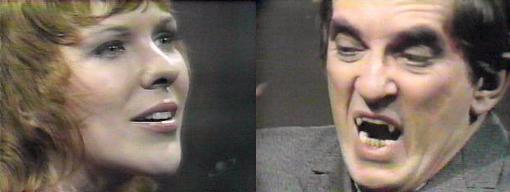 Back in front of the fire - Barnabas tells himself, I did what was right-there's no way for me with her, I feel, I shall do without her-I cannot make her what I am, I cannot give in to myself. Roxanne returns, her love a palpable presence in the room. This time, Barnabas takes her in his arms. Allow me to share whatever is wrong, she says-don't ever say no to me, please never say no to me! I cannot, he insists. Holding him tightly, she asks, what love--but sharing? He pulls away from her. Oh, you don't know, he says. I am willing to, she assures him-look at me-love me, Barnabas, love me! He stares at her a moment, then asks, "Whatever the cost?" Whatever, she promises, yes, Barnabas.