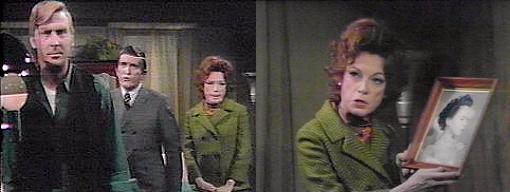 Back at Collinwood, Barnabas remarks to Julia, whatever the presence is, it can apparently materialize and dematerialize at will--I'm going back upstairs. The music begins again. No, protests Julia. Somewhere in a room upstairs, says Barnabas, someone or something is playing that music--it can't be very dangerous, because music is seldom used to frighten--if I can find it, I'll force whatever it is out. He heads upstairs. Julia is all set to follow him. Stay here, he orders. He ascends the stairs. Julia waits in the foyer, below the landing. A bust on top of the railing begins to teeter. "Julia, watch out!" shouts Barnabas. The bust falls only feet from her. Julia cries out, covering her face like the little boy in HOME ALONE. That woman! wails Julia--that woman Jean--it happened to her--Barnabas!--Barnabas! She races toward him, and the two of them exit Collinwood.