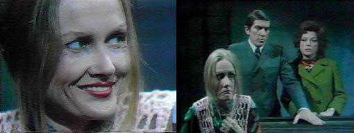 Barnabas says, "You recognized us." We were so worried, says Julia. You went far away, didn't you, says Carolyn, and now you've come back--or are you spirits? No, they assure her, and Julia holds out her hand, encouraging Carolyn to touch it. Carolyn flinches away, complaining, you look the same, and shouldn't. We'll explain, promises Barn. Why have you come here? demands Carolyn irritably, what are you doing in my house? Mrs. Johnson told us, explains Julia. We didn't know it was you, chimes in Barnabas. Mrs. Johnson told us that there was someone here who could tell us what happened at Collinwood, says Julia. Carolyn grins loopily, and the dark red lipstick on her mouth looks like devil horns on her upper lip. The effect is creepy. Nothing happened, says Carolyn craftily. We've seen Collinwood! says Barnabas. If nothing happened, says Julia, why are you living here? This is my home! cries Carolyn. But why? asks Barnabas, as she turns away from him--where are the others, Elizabeth, Roger? They will come back soon, says Carolyn, sounding off her nut. We've seen David's grave, says Barnabas. Carolyn laughs. Why are you laughing, asks Barnabas. Julia, watching closely, orders, Carolyn, stop it. 1970 was so long ago, remarks Carolyn. You remember it? asks Barnabas. Carolyn clasps her hands together and says, as if she's very clever--it was five years after 1965 and ten years before 1980. Why are you so determined to keep your secret? asks Barnabas. I love secrets, don't you? she replies, with another devious grin--I have learned to love them, yes. Tell us one of your secrets so we can understand what's happened, says Julia--we want so much to--we want to see Liz. Yes, says Carolyn excitedly, like a child. And the others, adds Julia. Carolyn, eyes darting back and forth wildly, says, that would be fun--we could have a picnic on the beach, and play games...she looks disturbed--what games could we play? she wonders, we are too old for games. Yes we are, agrees Barnabas, but you're still playing a game--why do you call yourself Fredericks? I can call myself anything I want! she says belligerently. Why don't you call yourself Collins? asks Julia. Carolyn darts her a frightened stare and says, that's not a good name, Collins, (whispered) they don't like it. Who doesn't? queries Barnabas--did you marry again? I married Jeb Hawkes, didn't you know? she asks. Yes, we were there at the time, says Barnabas. No you weren't! she accuses--Mother was, you weren't there. Soothingly, Julia says, we remember it. Then you have enough to remember! shouts Carolyn, you don't need anything more! Barnabas assures her, we do--what would happen if we returned to 1970? What year is this? asks Carolyn. 1995, answers Julia. Then why do you want to go back there? asks Carolyn--I don't want to leave here--I don't want to live through that again! Barnabas exchanges exasperated glances with Julia and demands, "Go through what?" Get out of my house! she blares, I didn't ask you to be here, I never wanted to see you, you weren't there! Julia tries to calm her. Carolyn, holding her white crocheted vest tightly around her throat, orders them back to wherever they came from--GET OUT!. . ."Spirits...spirits...ghosts!" Barnabas says her name, trying to reach her. We will be back, Julia assures her. Don't--ever--ever! cries Carolyn. They leave. She smiles insanely waiting a few moments to be sure they're gone. She exits the cottage.