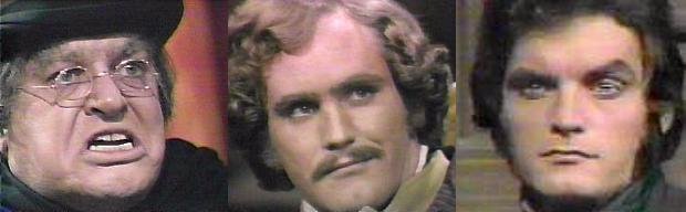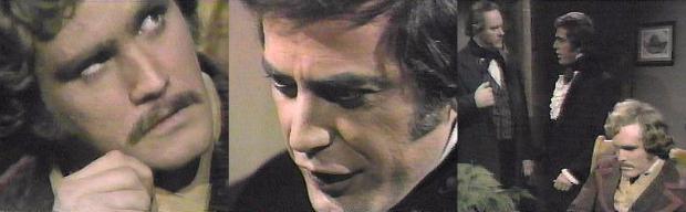 9:30 - Gabriel sits biting his nails.  Edith returns.  Were you out for a midnight stroll? he asks--you're lucky you have legs that can take you anywhere you want to go--where have you been?  The Old House, she says.  Did you go there because of Barnabas Collins? he demands, is he the object of your rather frantic devotion these days?  I won't answer that, she says petulantly, has Randall been here?  Randall?--ah ha, I think Randall is more your type, says Gabriel, I think Barnabas is far too cultivated to be attracted to the likes of you.  Has Randall been here? Edith asks again.  It does interest you, doesn't it? he asks--I'll tell you, my dear lady, I don't know, because I don't sit and clock all the comings and goings at Collinwood.  I'll find out from someone else then, she says.  He grabs her arm--you're an impatient lady, he says--we're going to sit here and have a chat--about why you went to the Old House--if you did.  All right, I did not go to the Old House, she says.  I'm waiting, he says.  For what, the truth? she asks, you won't face it about yourself or anyone else--so why bother with me, Gabriel?  Randall enters, bidding them both good evening--I'm glad the two of you are here--before I go to the police, I'd like to have your explanation of what is happening in this house--he holds up the paper with the witch's symbol on it.