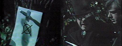 It's the devil's mark, says Grimes, removing the paper from the tree.  What are you talking about? asks Randall.  It's the same sign Quentin wears on that ring of his, replies Grimes--the same sign on Lorna Bell when they discovered her body--he left it as a warning for me--witchcraft--he took my herd by witchcraft, and he knows I'm going to the police, and he's trying to scare me off, but I won't be scared!  Are you sure it was Quentin? demands Randall.  Of course, there was some bushes between us, but it was him, insists Grimes, I'd know him anywhere--get that sister of yours out of that house and away from Quentin---before she ends up like Roxanne.  Grimes, says Randall, I want you to tell me everything you can about Quentin Collins and witchcraft.