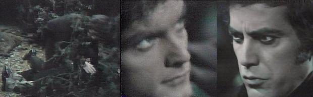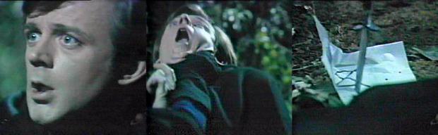 Woods - Grimes, heading for home, stops and looks around nervously.  Someone approaches him (we see men's boots).  Collins! he yells, come out and fight me like a man--I'm ready for you--you may be a warlock, but you can be killed like anyone else.  Drawing a pistol, he fires a shot; the figure retreats.  Randall meets up with Grimes, who claims, Quentin Collins is after me--help me catch him!  Randall follows Grimes through the woods.  They find a paper stuck into a tree with a dagger.