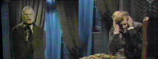 Midnight - Curtains blow in Daphne's room. Someone lies under the covers. The door opens; a hooded figure enters and raises a knife over the body. Gerard, who has been hiding under there in Daphne's stead, darts out from under the covers and thwarts the would-be murderer. "Yes! My God, it's you! It's really you!" he cries. (And another music miscue.)