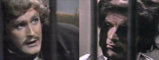 I don't understand, says Gerard, what is it that I have to explain? I wonder how the prosecutor of my case happens to be your very good friend, Charles Dawson, says Quentin--and why is he so determined to crucify me? And am I to be held responsible against the actions of a former friend? asks Gerard. Former? asks Quentin. Had no one told you that Charles Dawson and I are no longer friends? demands Gerard. Quentin, arms crossed, says no, no one told me anything. I was furious with him when he said he would accept the case! says Gerard, that he would prosecute you!--I asked him not to, begged him not to, but he refused--he's a very ambitious man, he wants to make a name for himself, even at your expense--so I told him our friendship was finished, that I was going to stand with you and not help him in any case whatsoever. Quentin listens carefully--I don't know what to say, Gerard--you know I want to believe you very much. Quentin, says Gerard, throwing up his arms--why don't you judge me for my actions?--he puts his hand on his shoulder--have I ever betrayed you in all the years we were at sea together? No, says Quentin. And I told you that as far as I was concerned, I only hold the position of a trustee or a caretaker until you are released and your innocence established, adds Gerard. I just wonder how it is that men like Barnabas and Desmond can be so much against you, says Quentin. I don't understand it either, admits Gerard, sitting beside Quentin on the cot--but they will be very interested to know you and I have a common enemy--I was attacked last night. Someone tried to kill you? asks Quentin. Very nearly did, says Gerard, and had not Leticia been there to stop them... Leticia? asks Quentin. Yes, says Gerard, I was in the drawing room-someone snuck in through the secret panel and Leticia entered and must have scared them off. Did you see who it was? asks Quentin. No, says Gerard, it happened too quickly, but it's obviously someone who knows that house quite well. I wonder who it is at Collinwood who would want to kill you? asks Quentin. More important, says Gerard, who's at Collinwood who wants to destroy the master of the house? What you're saying is, says Quentin, the person responsible for putting me in here is the same one responsible for trying to kill you. I believe so, says Gerard. Then why can't we find out the answer? demands Quentin--how come this person is able to remain so anonymous all this time? I don't know, says Gerard. Has Daphne received anymore letters? asks Quentin.