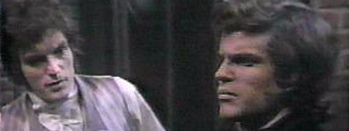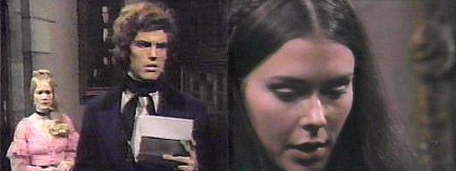 Alone now, a bemused Barnabas says, Angelique, you can pretend in front of Julia, but we know each other too well now for lies--you saved my life, tell me the price now. There is no price, she repeats--none. He turns away. I don't expect you to believe me, she says, not after all we've been through, and I've only myself to blame--only myself. You are extraordinary, he says--I've seen you play this scene many times, but I must confess, I've never been so convinced. Perhaps it's because it's the truth, she says. What is the truth? he asks. That I love you, she says passionately--that no matter how much I fight my feelings, I will always love you. Spare me this charade, says Barn, you do not love me, Angelique--you only want power over me. She gazes at him with huge eyes and asks, why, then, did I lift your curse--you're free of me now, I have no hold over you--"Barnabas, I did want you for myself, but rather than see you dead, I would see you free of my power--and free of me--why do I love you?--you reject me, revile me, despise me..." Barnabas surveys her skeptically--haven't you given me reason? Yes, she says, I admit that--I wanted you, I couldn't bear to have anyone else have you--but everything I have done, none of it has given me your love. We cannot love at will, he says gently, moving in close, anymore than we can prevent our love. How well I know that, she sighs--that's why I ask nothing in return for your life that you can't give me willingly--all I want is your love--but only if you're able to give it--I only ask that you try. Right now, he says softly, I almost feel like I'm an ordinary man and you're an ordinary woman (and there are beds galore upstairs). But you are an ordinary man, she reminds him, now that the curse has been lifted. Forever? he asks. She turns away. "Forever?" he repeats insistently--"You are silent." Yes, she says, it will be forever, I swear it--oh, Barnabas, hold me--I'm so afraid of losing you--you're human now, like anyone else, you can die, and you have enemies--please, just hold me. He takes her into his arms, holding her close. Do you believe me now? she asks.