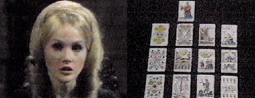 At Collinwood, the continually daffy Millicent reads the Tarot (I guess Natalie gave her lessons). She sees the death of a feeling and talks to the absent Nathan--it's the death of her love and the birth of her hatred towards him, which won't go away until he's punished! The moon and chariot reveal news hidden for a long time (Nathan's marriage)? Bad news for the lover--Nathan!