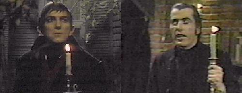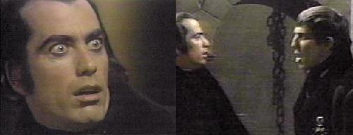 "You're dead!" shouts Trask. I heard voices calling me here, says Trask, rapidly growing more and more terrified as the vampire plays with him, batting him mentally back and forth like a cat with a rat. Barnabas reproduces Abigail's voice, showing him how he lured him there, then demands to know why he tried to destroy Victoria Winters. She was a witch, insists Trask. Barnabas tells him that was only in your feeble mind, you had no pity for the girl and therefore, I will show you none! He shows Trask the alcove--"Your tomb," says Barnabas. When Trask tries to run, to escape him, Barnabas grabs him and tells him he will learn the true meaning of darkness in that alcove. Trask babbles--I was wrong, I'll help Miss Winters, anything!--I DID persecute her, he agrees. Barnabas cruelly suggests he commit that confession to paper, which Trask does, his hand trembling terribly, then signs it. Barnabas reads and is satisfied, but when Trask asks when he can go, he tells him very soon--his final resting place isn't quite ready. Trask expresses disbelief, but Barnabas says he never promised to free him--then grabs him and propels him into the alcove. He'll be in a prison of his own making, chortles Barnabas.