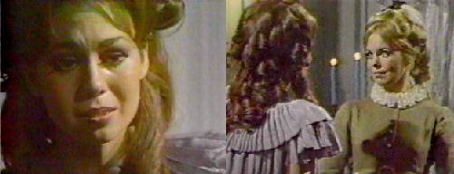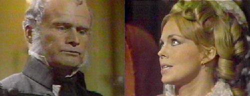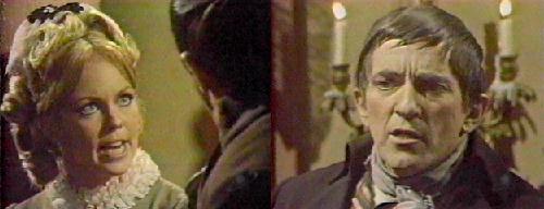Angelique enters and tells Barnabas that Sarah is doing well, chafing at being kept in bed. She kneels beside Barnabas, who is sitting in a chair, and asks him if he'll tell Josette that they're getting married. What? asks Barnabas. She blathers on about how it will surprise everyone, that many will think her unworthy, but she's going to be a good wife and make him happy. Huh? They never spoke of marriage! he says. She reminds him of his forgotten promise, but he gets flustered and says he only said that because he was willing to do anything to help Sarah get well--he was desperate! Realizing he's trying to weasel out of his promise, Angelique tries reverse psychology. If he doesn't want to marry her, she releases him from his promise! He's grateful, he says, and didn't want to hurt her. No, he just doesn't want to marry her, she cries, and bursts into tears. He asks her not to cry--he wants to be fair, but he loves Josette, and while there can never be anything between him and his uncle's wife . . . She accuses him of not wanting her because she's only a servant, not a great lady like Josette, so he can't care as much for her! (amazing manipulation, Ang!) "I love you, but you cannot love me or accept me as your wife," she sobs. He looks miserable and uncomfortable, but says if she can accept him as he is, with all these heavy, complex feelings for Josette, OK, he'll marry her. She hugs the dejected bridegroom-to-be, promising him happiness and obedience. He tells her not to tell anyone, he'll do that, including breaking the news to Josette. She agrees, promising that will be a practice in their married life--she will be an obedient, devoted wife (brother!).