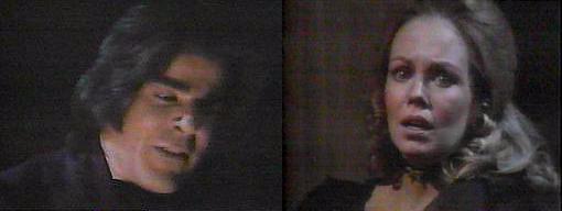 Bramwell examine the doors--I'm going to try to break it down, he insists. It's no use, says Catherine tiredly, leaning against one of the bedposts--we're here at least until morning, if not longer. No, he says, our child must live! She shakes her head--I suddenly feel so tired. Sit down, my darling, he urges, helping her to a chair--sit over here--I'll try the door. He picks up a wooden chair and tosses it at the door; it bounces back at him, catching him in the hand (that musta hurt!) No, he says, then takes a letter opener and tries to break the lock. When that fails, he tosses it to the floor, vowing in a ragged voice, I'll get you out of here! The wind blows, the lights flicker. What's happening? asks Bramwell--something's happening--Catherine, are you all right? He goes to check her--thank heaven you're all right. Why do you keep calling me Catherine? she demands--my name is Amanda! Bramwell stares at her in dismay, shaking his head.