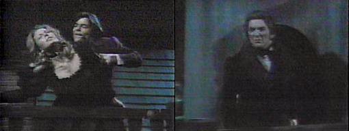Bramwell, gasping, "NO!", continues to grapple with Brutus' ghost, who is choking the life from him. Catherine watches in horror. Suddenly, it's over. Are you all right? she asks, holding onto his arm, clinging to him. Yes, I am now, he assures her, his voice rough--I must heed my own advice, I wasn't ready for that--he will try once more before this night's over.